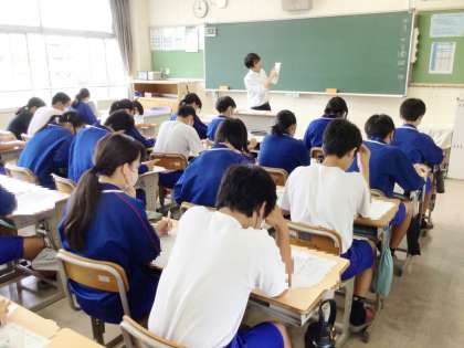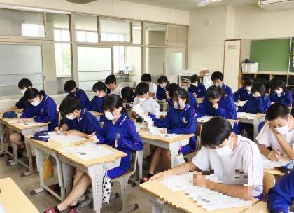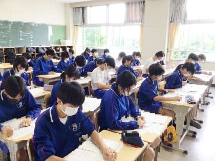 32学級は、理科の授業の様子です。前期中間テスト返却後、テストの解説を聞きながら、解き方、考え方を確認していました。