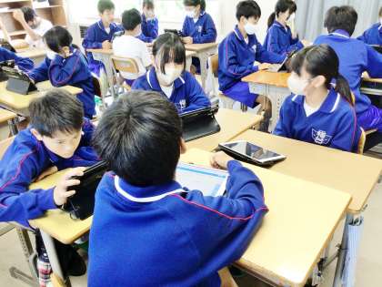 本日、豊田市教育委員会の方が来校し、授業の様子を見られました。授業を見られた教育委員会の方から「子どもたちが自分の考えを生き生きと発表するなど、子どもたちの学ぶ姿勢が大変すばらしいです」「学習用タブレットなどのICT機器を積極的に活用して、学習に取り組んでいますね」という話がありました。