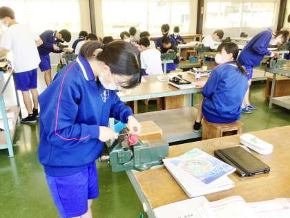 22学級は、技術の「金属加工〜キーホルダー制作〜」の授業の様子です。棒やすりや紙やすりを使って削ったり、ピカール液で磨いたりと、完成に向けて集中して取り組んでいました。来週には、作品を持ち帰ると思います。一生懸命作った作品をご家庭でご覧いただければと思います。