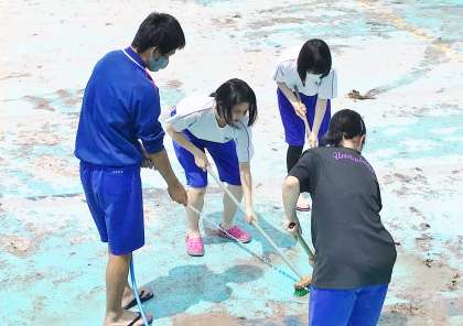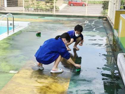 6/11(火) プール清掃の様子です(3年生) 1 公開日 2024/06/11 更新日 2024/06/11 お知らせ 本日、31学級、32学級が体育の時間を使って、プール清掃を行いました。プールの中、プールサイド等、様々な個所の清掃を一生懸命行っていました。「汚れが取れていくと気持ちかいい!「みんなと一緒に行うと楽しい!」という明るい声が聞こえてきました。清掃活動ありがとうございました。