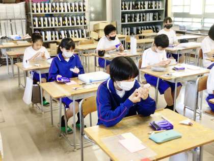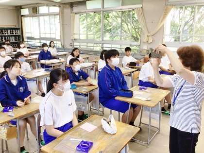 13学級は、美術の「サンドブラスト工芸」の授業の様子です。制作のときに使用するカーボン紙とトレーシングペーパーの説明を集中して聞いていました。