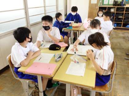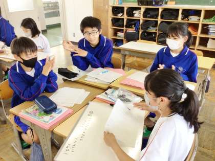 13学級は、国語の「話題や展開を捉えて話し合おう」の授業の様子です。話し合い活動を充実させるための方法を、実際に班で「クラスレクで何を行いたいか」について話し合いを行いながら、考えていました。