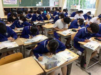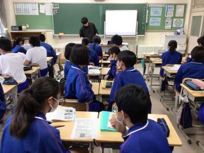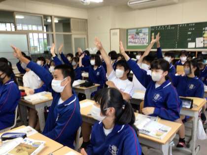 32学級は、社会の「民主化と日本国憲法」の授業の様子です。資料をもとに各自で授業プリントをまとめ、その内容を隣同士で説明しあったり、全体で確認したりして、学びを深めていました。