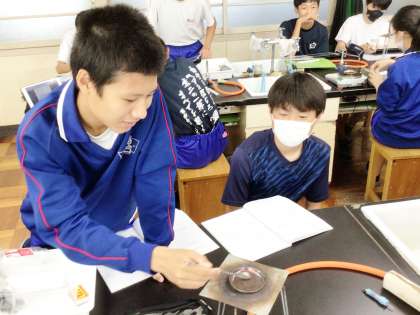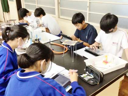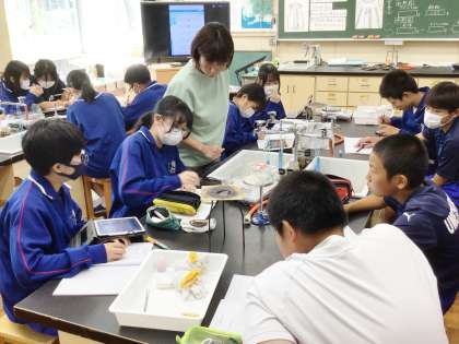 23学級は、理科の「化学変化と物資の質量」の授業の様子です。銅を加熱したときの質量の変化について、実験を行い検証していました。また、実験の結果について、学習用タブレットにまとめていました。
