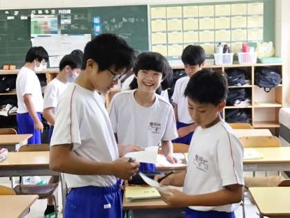 14学級は、英語の授業の様子です。今まで学習した内容の復習をALTがクイズ形式で問題を出しながら行っていました。生徒たちはALTが出す問題を級友と相談したりしながら楽しそうに取り組んでいました。