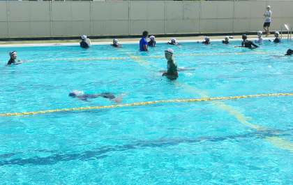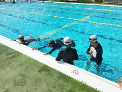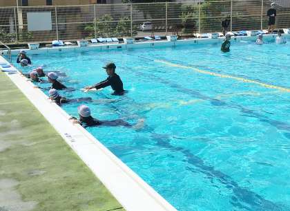 21学級は、体育の「平泳ぎ」の授業の様子です。平泳ぎの足の動きを教科担任が実際に見せていました。生徒たちは「足の動きは難しいな」と言いながら、繰り返し練習していました。