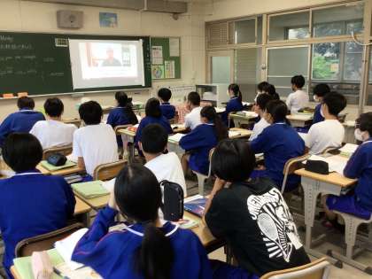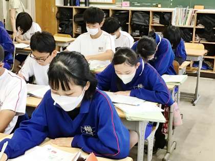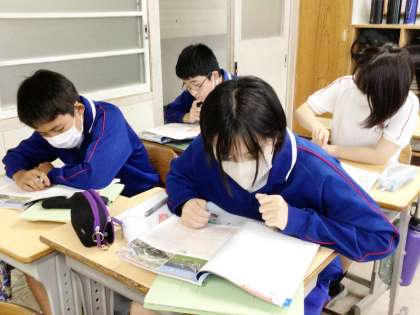 33学級は、英語の「Unit3」の授業の様子です。「let(help)+(人など)+動詞の原形」の文法の表し方について、デジタル教科書の映像を見て確認した後、練習問題を集中して解いていました。