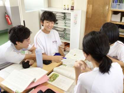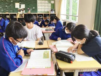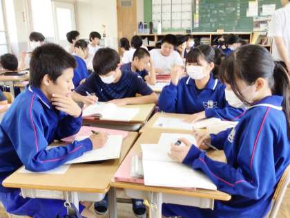 23学級は、国語の「盆土産」の授業の様子です。登場人物の関係性を確認した後、物語の流れについて班で話し合っていました。
