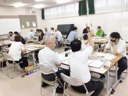 協議事項では、本年度の重点取組事項である「大規模地震が発生した際の学校・園・地域の対応」について、参加者を6つに分けた小グループで話し合いました。どのグループも、積極的に意見交換が行われ、その後の報告では、「避難状況を把握し、情報共有の行い方を考えておく必要がある」「地域の動ける人は、避難所になっておる学校等にボランティアとして活躍できるようにしたい」「こども園と小学校は近いので連携して避難を行っていきたい」などのご意見が出されました。