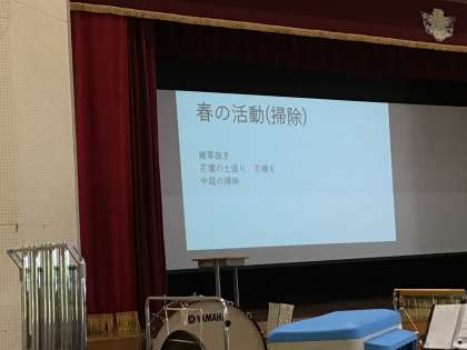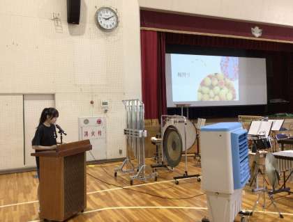 校内の清掃活動、若草苑での奉仕活動、梅の実収穫、プール清掃、行事の準備など、みんなのためになることをいろいろ行ってきました。その内容を、「春の活動」「夏の活動」というように季節ごとに分け、写真を見せながら紹介しました。