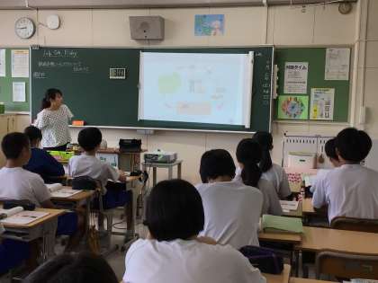 33学級は、英語の「Unit3」の授業の様子です。始めにデジタル教科書の動画や本文をもとに、絶滅危機にある東ローランドゴリラについて考え、ペアや全体で共有しました。次にプリント学習に取り組むことで、その学びを深めました。