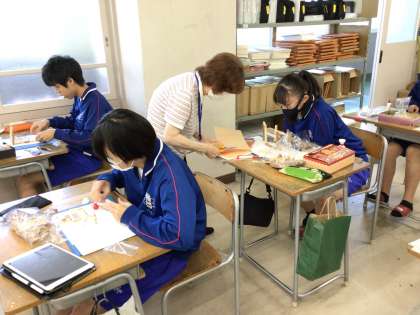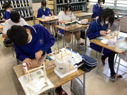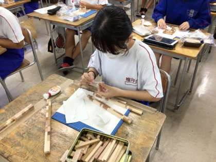 32学級は、美術の「寄せ木細工」の授業の様子です。つまようじや綿棒を使って細かい部分に木工用ボンドを付けたり、はみ出したボンドをサンドペーパーで削ったりしながら、目的の形をめざして立体的に木片を組み立てていました。