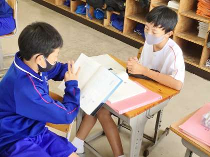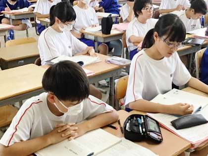 12学級は、国語の「詩の世界」の授業の様子です。文語詩、口語詩など詩の文体について学習プリントにまとめた後、教科書の詩の文体について話し合っていました。