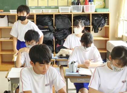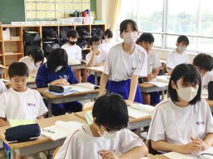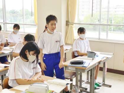 14学級は、数学の「方程式」の授業の様子です。等式の性質を使って解いた問題の答え合わせを行っていました。積極的に挙手し、自分の考えを発表していました。