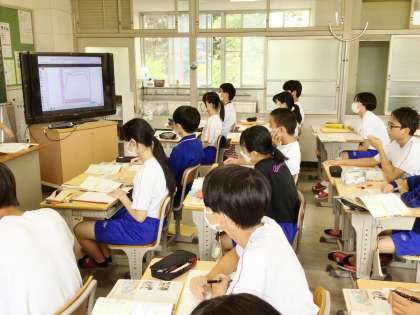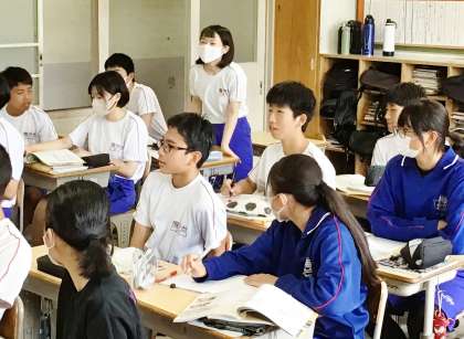 33学級は、社会の「平等権」の授業の様子です。男女平等について、「女性の年齢別の働いている割合」のグラフを見たり、ハラスメントの問題について話し合ったりしながら、理解を深めていました。