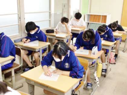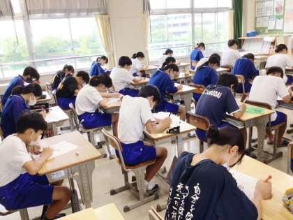 22学級は、社会の「日本のさまざまな地域」の単元テストの様子です。このテストは9月に行われる前期期末テストの範囲です。解けなかった問題は復習しておきましょう。