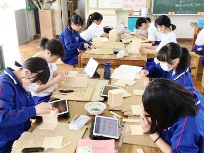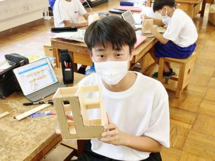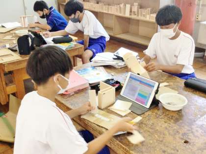 12学級は、技術の「オリジナル木工製作」の授業の様子です。発泡スチロールを使って、実際に作る作品の試作作りを行っていました。工夫が至るところに施されていて、「オリジナル」を強く感じました。