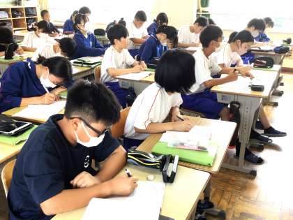 23学級は、理科の「動物の体のつくりとはたらき」の授業の様子です。消化の仕組みついて、大切なポイントをノートにまとめていました。