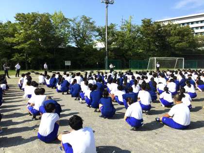 本日、避難訓練をWBGTが上がることを考え、暑さ対策として1限に行いました。生徒は、避難の指示を集中して聞き、迅速に運動場に移動していました。大規模地震が起きた後の対応について、6月に行われたコミュニティースクール会議で話し合ったことを中心に話を行いました。