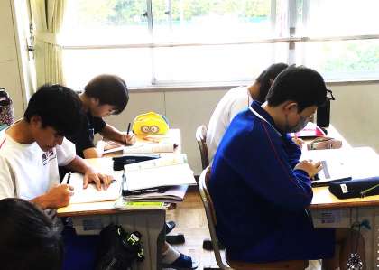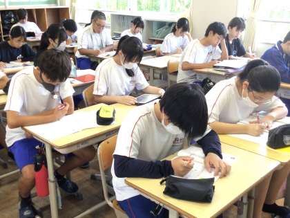 2年生の朝の学習の様子です。明日から行われる前期期末テストに向けて、キュビナや学習プリントの問題を集中して解いていました。