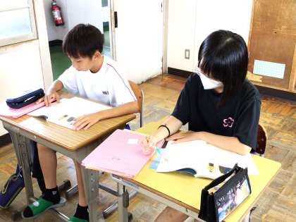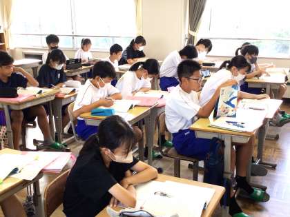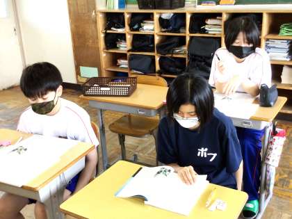 9/19(木) 授業の様子です(1年生) 3 公開日 2024/09/19 更新日 2024/09/19 お知らせ 13学級は、国語の「星の花が降るころに」の授業の様子です。教科書CDから流れてくる音声を集中して聞きながら、本文の内容を把握していました。