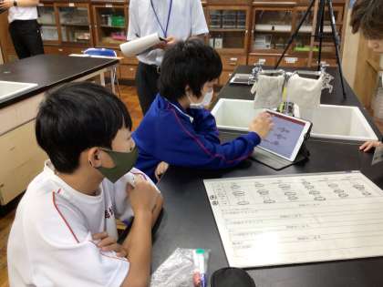 班での話し合いが停滞し始めても、PowerPointの共有機能を活用して、新たな情報をもとに話し合うなど、より最適な方法を解明するために粘り強く取り組んでいました。授業後も粉末の性質や実験方法の特性をもとに意見を言い合う生徒もおり、納得がいくまでとことん取り組む姿がありました。