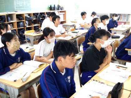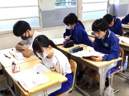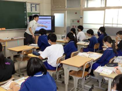 31学級は、社会の「政党の役割」の授業の様子です。政党の主な公約について、デジタル教科書の映像や教科書の資料を見ながら、理解を深めていました。