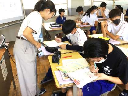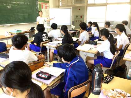 21学級は、英語の「Unit4」の授業の様子です。助動詞のまとめを行っていました。学習プリントや教科書の問題を解きながら、「can、will、may、must」について確認していました。