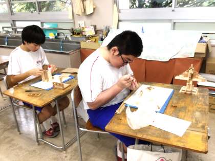 31学級は、美術の「寄せ木細工」の授業の様子です。いよいよ来週で完成です。木工用ボンドで細かい部分の木片をつけたり、金ヤスリで木片の角を丸く整えたりと、完成に向けて集中して取り組んでいました。