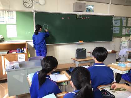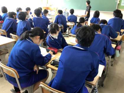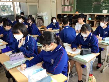 32学級は、数学の「相似の証明」の授業の様子です。すでに習っている三角形の相似条件をもとに、正方形を2つ重ねた図にできた三角形が相似かどうかを考えることで、相似についての理解を深めるとともに、相似の証明の仕方を学びました。