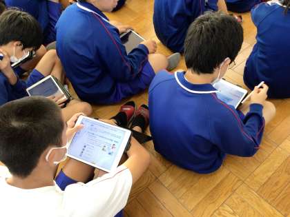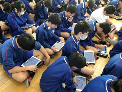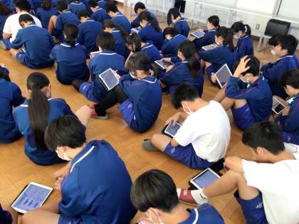 学習用タブレットに送られた資料を見ながらWeb出願についての説明を聞いている様子です。