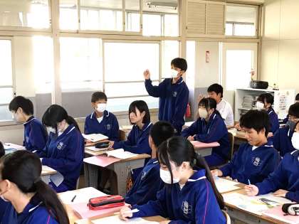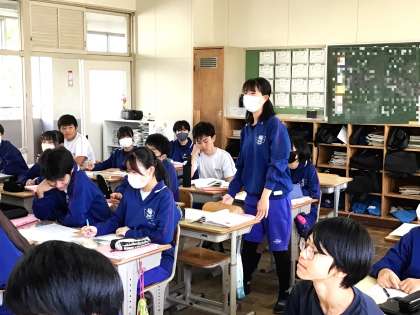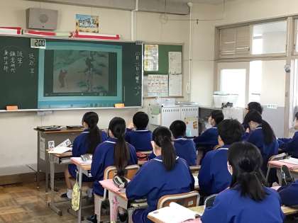 23学級は、国語の「仁和寺にある法師—『徒然草』から」の授業の様子です。徒然草について既習したことを確認したり、デジタル教科書の映像を見たりしながら、当時の様子についてのイメージを膨らませていました。積極的に発言するなど、意欲的に学習に取り組んでいました。