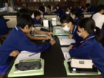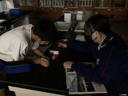 11学級は、理科の「光の性質」の授業の様子です。学習課題「反射した光は、どう進んでいるのか」について、実験を行っていました。実験の結果から、「反射の法則」について理解を深めていました。生徒からは「実験をやると、よくわかる」という声が聞かれました。