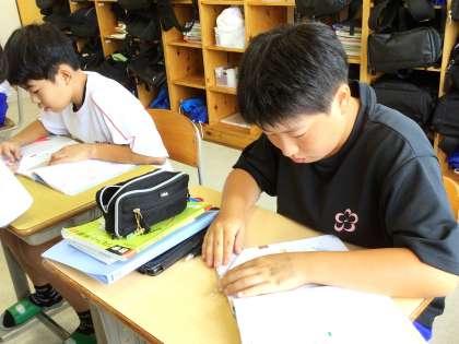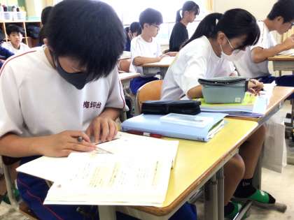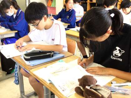 14学級は、数学の「平面図形」の授業の様子です。垂線について、定規を組み合わせながら、書き方を確認していました。