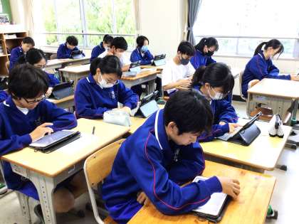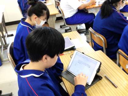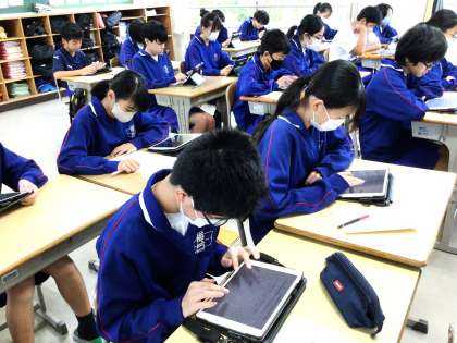 11学級は、社会の授業の様子です。「古代までの日本」の単元テストで間違った箇所を見直し、自分が復習したい分野をキュビナの問題を解きながら確認していました。「どの分野を選んだの?」と聞くと、「私は、飛鳥時代を選びました。聖徳太子の頃が苦手なので。しっかり復習します」と答えてくれました。学級全員、自分が選んだ分野のキュビナの問題を一言も言葉を発することなく、集中して解いていました。