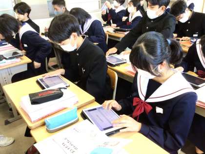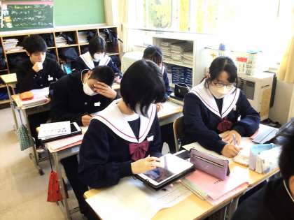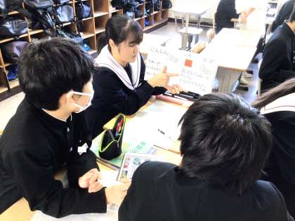 32学級は、家庭科の「幼児の生活と家族」の授業の様子です。幼児と遊ぶときに幼児に伝えたいことを絵本にまとめていきます。その絵本のストーリーを先輩が作成した絵本を見たりしながら考えていました。