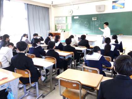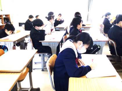 11学級は、数学の「後期中間テストの返却」の様子です。間違いが多かった問題の解説を聞きながら、解き方、考え方を確認していました。