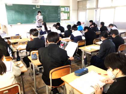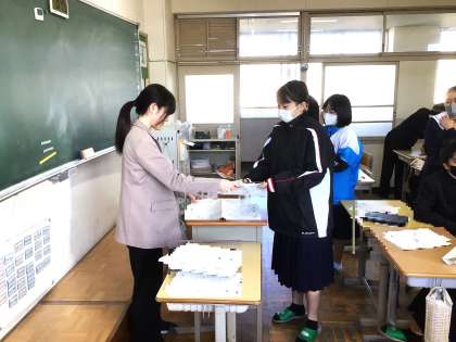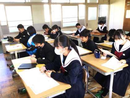 13学級は、理科の「後期中間テストの返却」の様子です。間違いが多かった問題の解説を聞きながら、解き方、考え方を確認していました。解説後、テストの返却を行っていました。