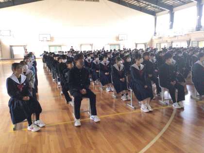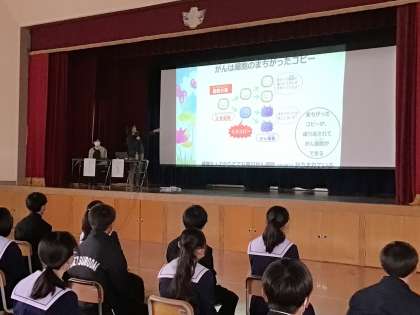 愛知県がんセンターの職員など2人の方が来校し、「がんという病気について考えよう」のテーマで、「がんは予防できる場合があること」「がんの早期発見、がん検診」「がんの治療」等について話を行いました。