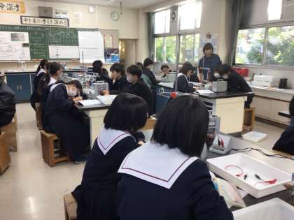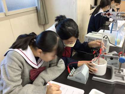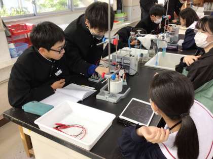23学級は、理科の「電力と熱量の関係」の授業の様子です。グループごとに回路を組み立て、記録係、タイマー係、温度計係などと役割を分担して、実験を行っていました。