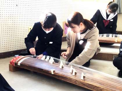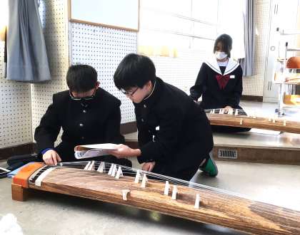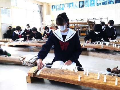 14学級は、音楽の「箏—さくらさくらー」の授業の様子です。今日は、「さくらさくら」の発表です。発表前の練習時間では集中して練習を行うなど、一生懸命取り組んでいました。