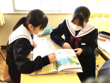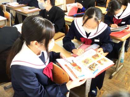 23学級は、国語の「扇の的—『平家物語から』—」の授業の様子です。平家物語に登場する武士について、図書室から借りてきた「平安末期の武士について」の本を読みながら、イメージを膨らませていました。