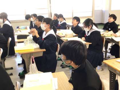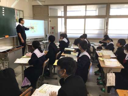 11学級は、英語の「道案内—質問する・説明するー」の授業の様子です。「道順を尋ねたり、教えたりするときに英語でどのように話せばいいのか」を教科担任の話を聞き確認していました。来週、「道案内」についてALTと会話を行うことを伝えると、歓声が上がっていました。