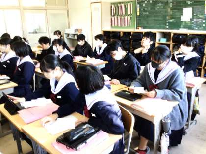 32学級は、家庭科の授業の様子です。まとめテストを返却後、間違いが多かった問題の解説を聞き、解き方、考え方を確認していました。