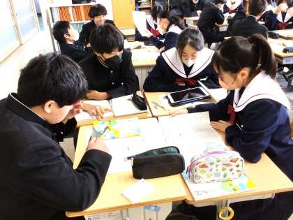 22学級は、国語の「扇の的—『平家物語から』—」の授業の様子です。「与一が弓を射るまでの気持ち」について、班で考えを聴き合いながら学びを深めていました。