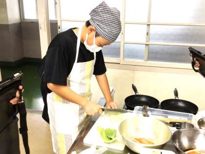生徒は、2回目ということもあり、前回より、手際よく調理を行っていました。調理後、「キャベツのせん切りで、同じ幅に切るのが難しかった」「肉は、思っていたより早く焼けたので驚いた」と感想を言っていました。