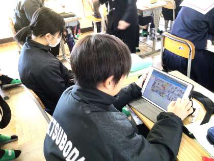 13学級は、理科の「力のはたらき」の授業の様子です。教科書の資料を見ながら、「どういう力がはたらいているのか」について力の向きの矢印を書き込んでいました。その後、班で書き込んだ力のはたらきについて、話し合っていました。