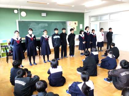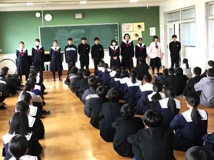 12/16(月) 学級活動の様子です(2年生) 公開日 2024/12/16 更新日 2024/12/16 お知らせ 2年生の学級活動の様子です。 来月行われる自然教室に向けて、学年集会を行っていました。学年集会では、立志式実行委員が、立志式で行う「誓いの言葉」を気持ちを込めて発表していました。立志式実行委員の「誓いの言葉」が終わると、自然と大きな拍手が沸き起こっていました。この後、教室に戻り、「誓いの言葉」の練習を全員が行います。きっと、一生心に残る立志式になると思います。