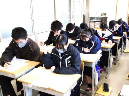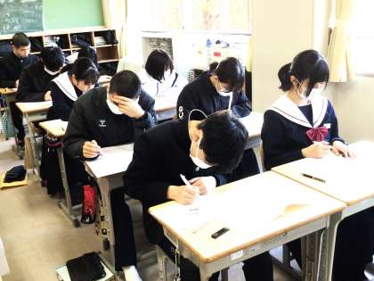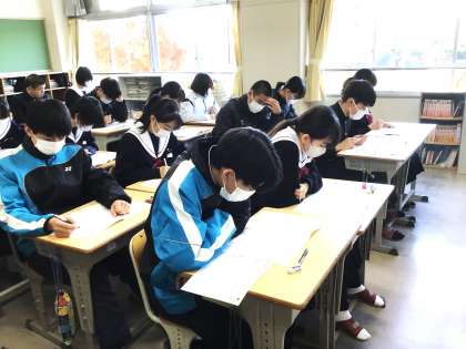 12/17(火) 授業の様子です(3年生) 2 公開日 2024/12/17 更新日 2024/12/17 お知らせ 32学級は、社会の授業の様子です。入試に向けて対策プリントを行っていました。問題を解いている表情から、緊張感が伝わってきました。
