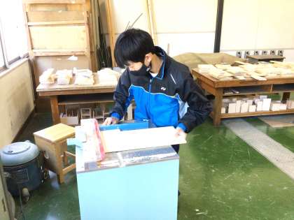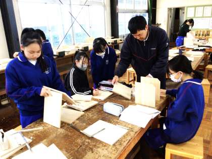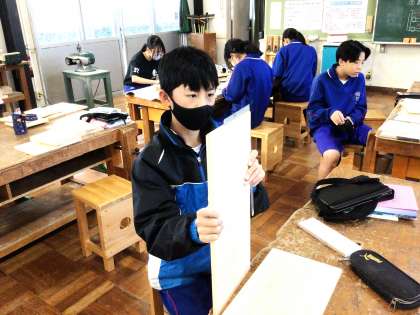 12学級は、技術の「オリジナル木工製作」の授業の様子です。仮組み立てを行い、ゆがみ・すき間がないか確認していました。ゆがみ・すき間があると、木口切断機やかんなで削りながら調整していました。